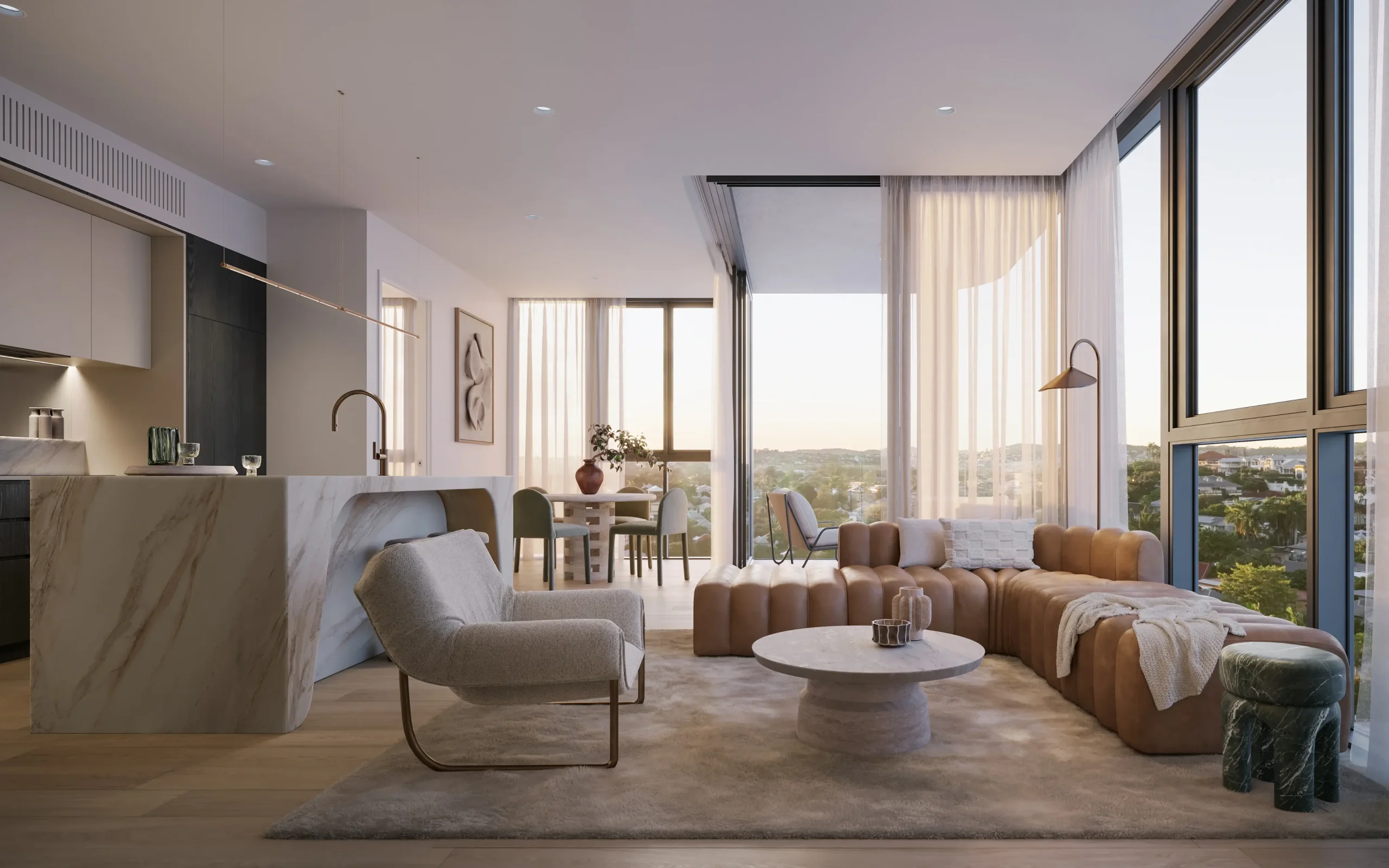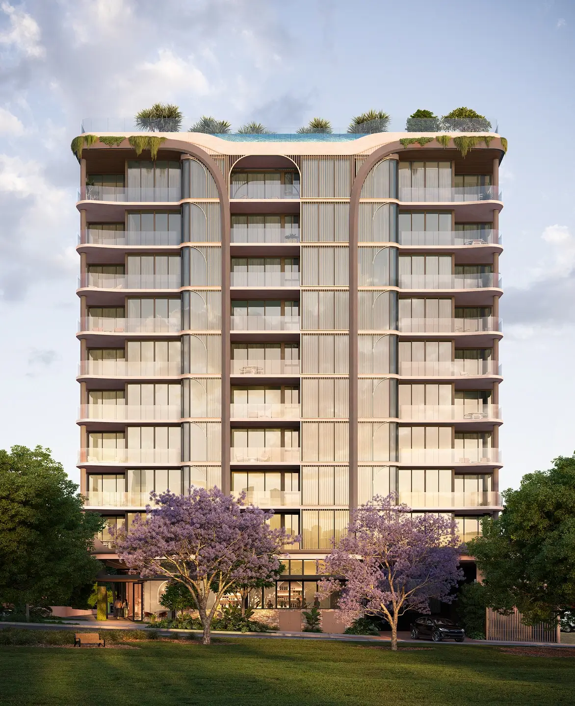 Banksii’s symmetrical form is defined by flowing curves, warm tones and floor-to-ceiling glass. Branching upwards, the architecture blends modern living with a connection to natural surroundings.